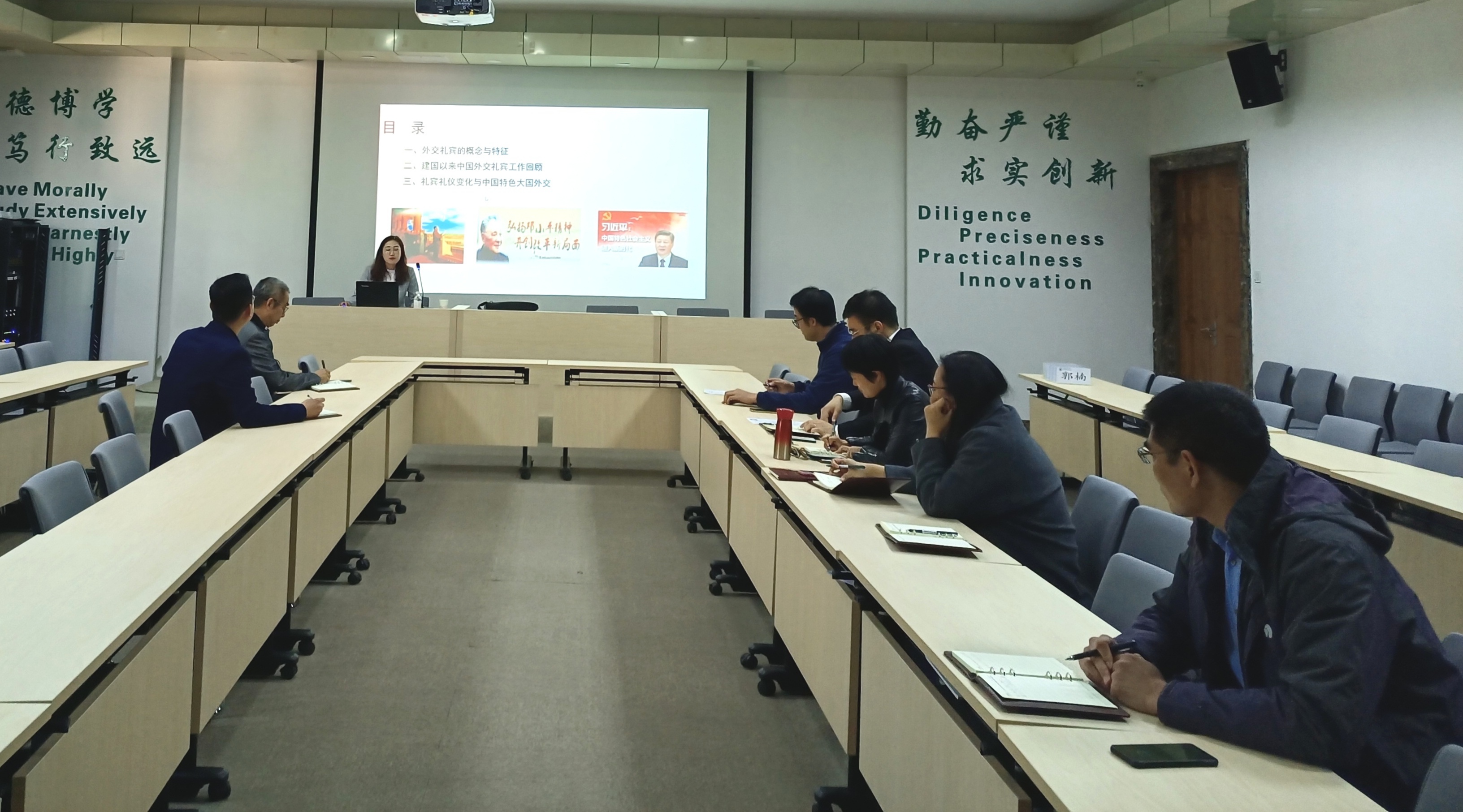 4月15日下午,永利yl23411官网结合本部门工作实际,特邀学校马克思主义学院刘耀虹博士在专家楼115报告厅为全体人员做题为《外交礼宾礼仪与中国特色大国外交》的专题宣讲。