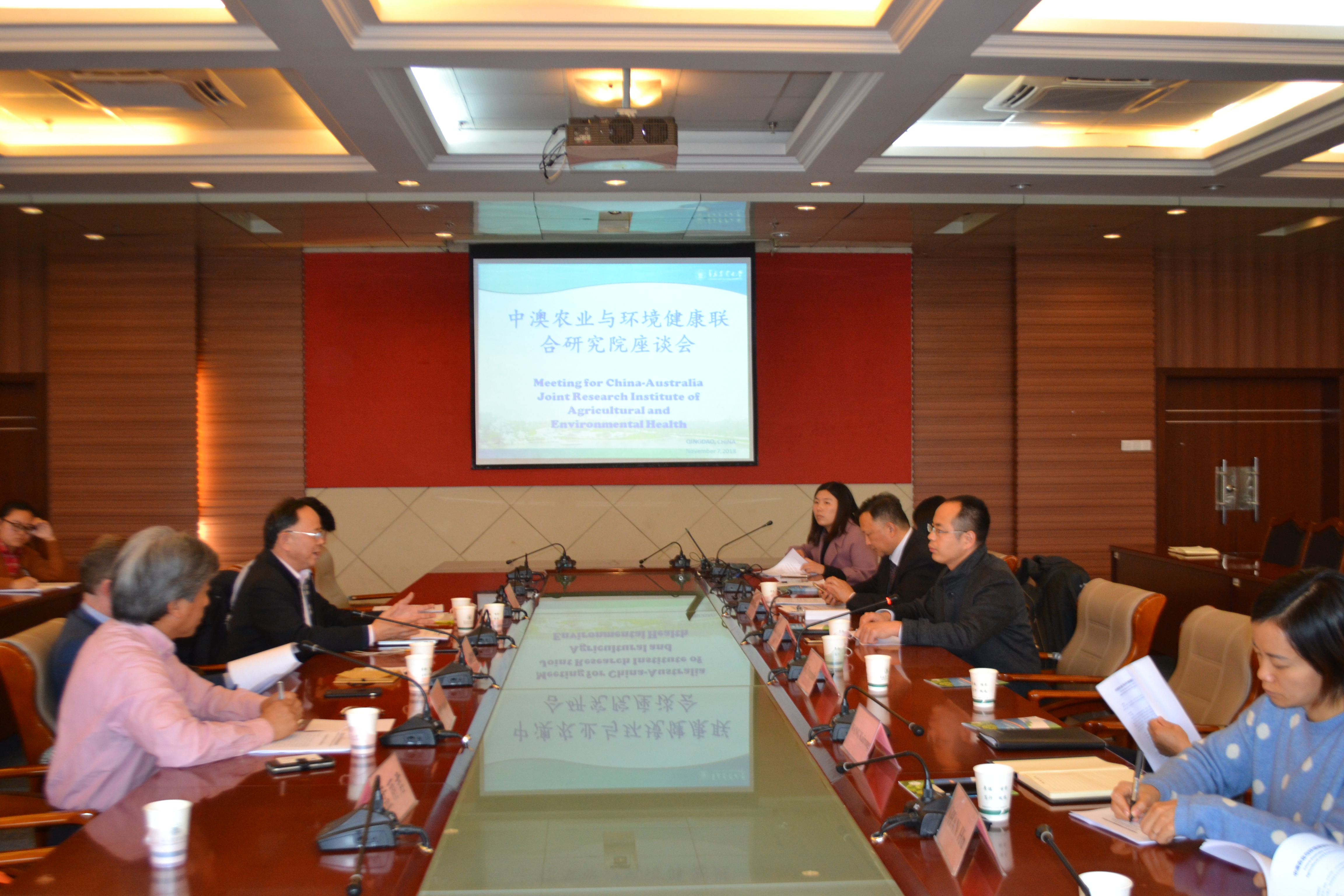 中澳农业与环境健康联合研究院双方负责人及核心成员就研究院的办院理念、目的与任务、组织机构、联合研究院研究机构等方面进行了详细讨论,进一步完善各项内容。